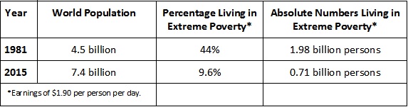 This reduction in poverty over the past quarter century is not only in percentage terms, but also in absolute numbers. In 1981, when the world population was only 4.5 billion, 44 percent or 1.98 billion humans lived in abject poverty. In 2015, even though the world population nearly doubled to 7.4 billion individuals, the abject poverty rate fell to 9.6 percent, which means that only 710 million today live in extreme poverty.