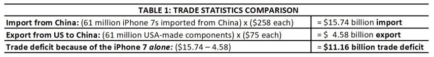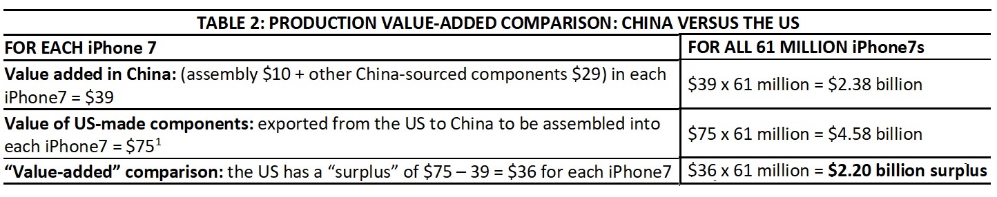 By comparing the bottom-line numbers in TABLE 1: TRADE STATISTICS COMPARISON with TABLE 2: PRODUCTION VALUE-ADDED COMPARISON, we can see how misleading it can be to look only at trade data. These data seem to show that the iPhone7 alone causes an $11.16 billion trade deficit, whereas the value-added comparison shows a surplus for the US of $2.20 billion.