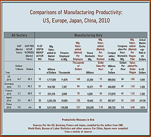 Incidentally, in Figure 3 we see China coming out on top in one productivity measure, the ratio of $ Value added per worker divided by the $ Wages paid. But that is because the denominator — Chinese wages — was so low[4] compared to US and European wages, labor supply in China being 118 million manufacturing workers, compared to only 11.9 million in the US.