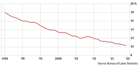 Figure 4: Percentage of US Workers That Are Members of Unions