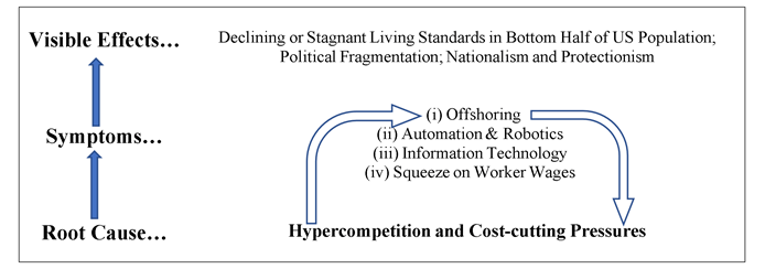 However, in my view, even the components of this alternative explanation — automation, robotics, and ICT –are actually the visible symptoms of an underlying root cause, namely hypercompetition. See Figure 5. In considerable part, competition results in downward price pressures. In turn, that forces companies to cut production costs under two broad strategic choices: (1) send production offshore and/or (2) automate with more “intelligent” machines that need fewer workers. Both result in layoffs, although less so under option (2). I hypothesize here that automation has resulted in far more US job losses than has offshoring. Conclusive studies are lacking, although we have weak evidence of this in Miller (2016), Jaimovich and Siu (2019), and Baldwin (2019). A third option also enables companies to reduce costs: (3) squeeze or reduce worker wages, given the weakening of union strength.