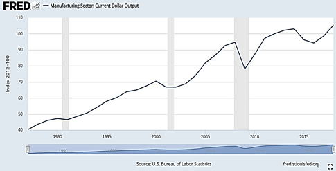[2] Even in inflation-adjusted terms, US manufacturing output in 2019 was near its 2007 high.