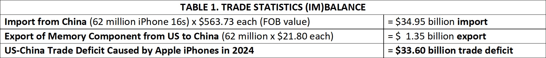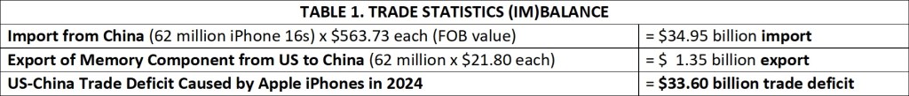 According to Liang & Chen’s estimate,[7] 62 million finished iPhones were imported from China into the US in 2024. Taking that as a measure, and for discussion purposes using the iPhone 16 cost numbers, we get the trade (im)balance shown in Table 1.