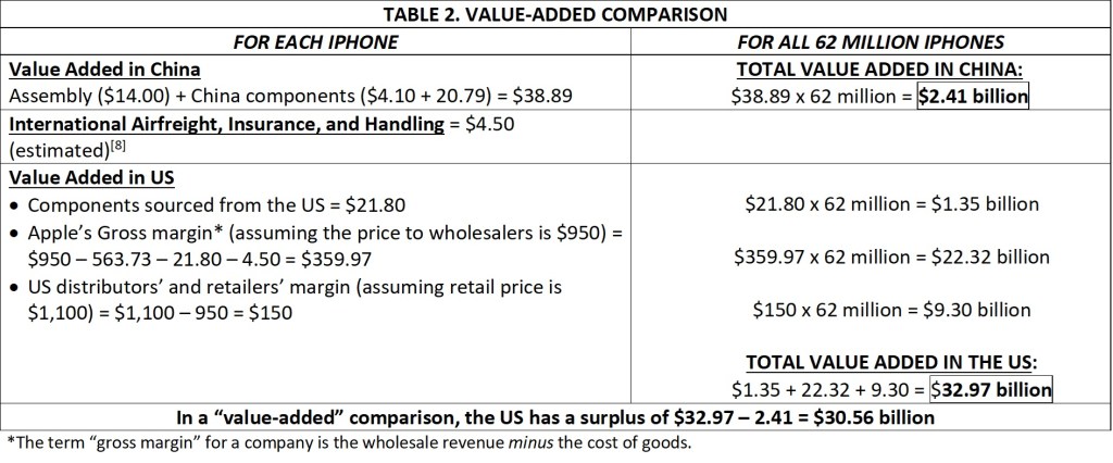 The estimates in Table 2 show that the value being added in China is only $2.41 billion annually (for the battery, case, and assembly of each phone).[8] The value added in the US is for the US-sourced components ($1.35 billion), plus the gross margin of Apple Inc. ($22.32 billion) and its distributors and retailers ($9.30 billion), totaling $32.97 billion.